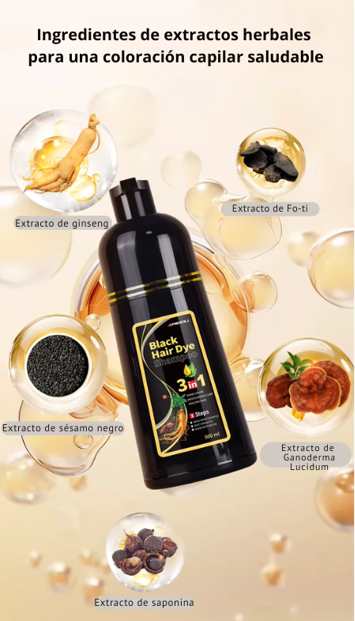 Nuestro shampoo está diseñado con ingredientes naturales que cubren las canas de forma uniforme mientras nutren y fortalecen el cabello. No solo tiñe, también cuida tu cuero cabelludo y deja el pelo suave, brillante y con un color natural.